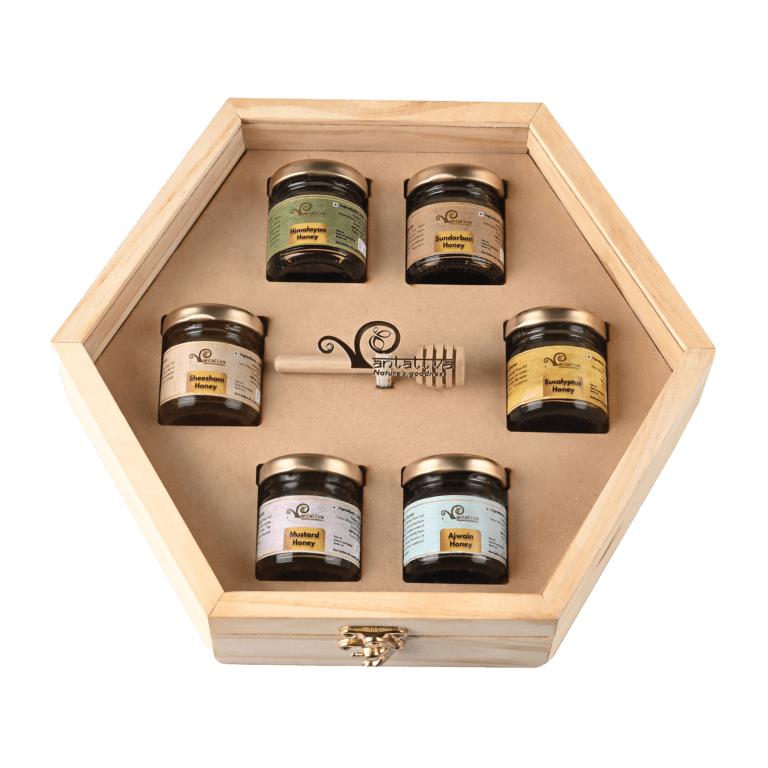 Pinewood Hexagonal Box: Pack of 6 unique varieties and wooden honey dipper