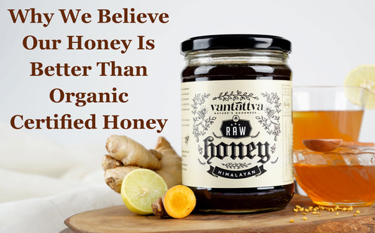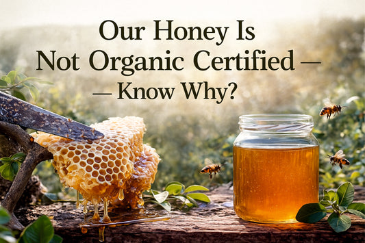 Organic certification, in the case of honey, is granted only to honey taken from wild forest hives. But harvesting this way often disturbs natural colonies and is typically done using traditional, unhygienic methods — cutting hives, collecting in used containers, and extracting whatever is available, often before the honey is fully mature. Such honey lacks nutritional strength and natural thickness, and often requires heating later, reducing its raw qualities.