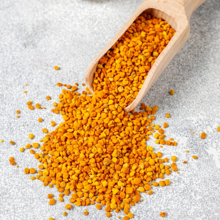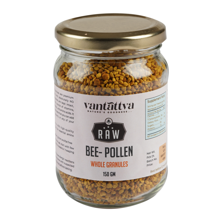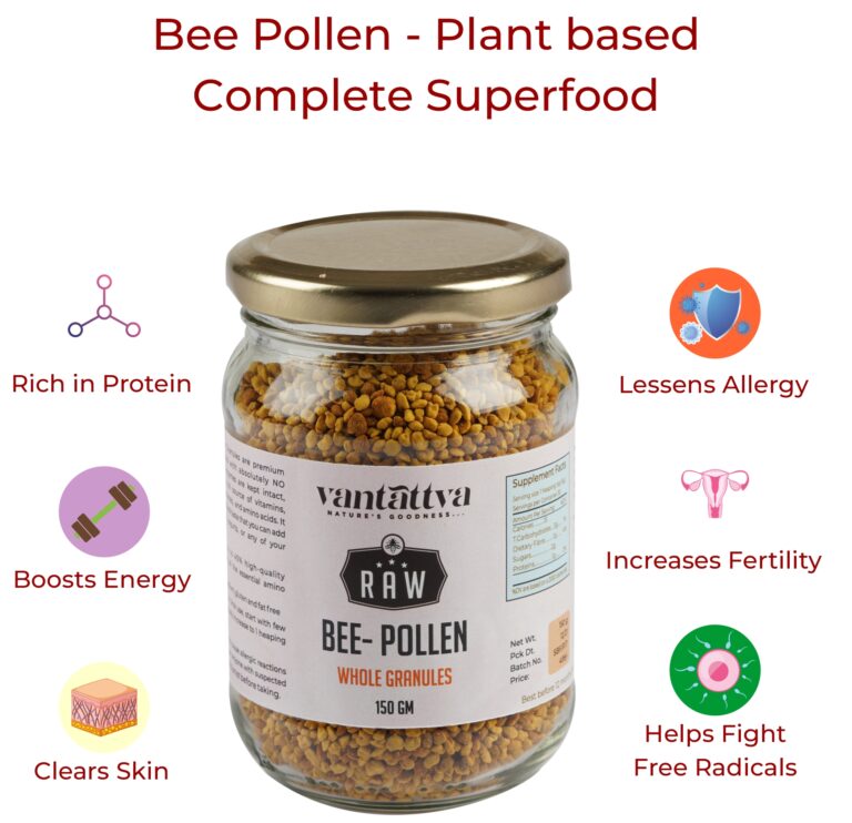 - Pollen: It is a very good source of antioxidants and helps in building immunity against common cold, cough, and seasonal allergies. In addition, it is a very good source of protein. 6 grams of pollen is equivalent to 100 grams of pulses. Raw, unfiltered honey carries 20-25 times the pollen count compared to processed honey.